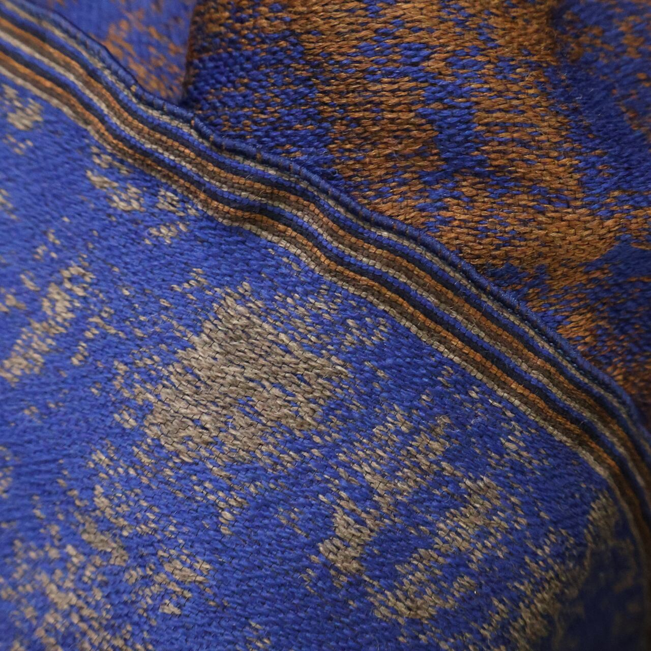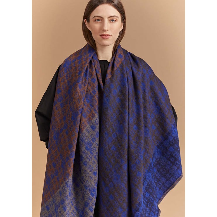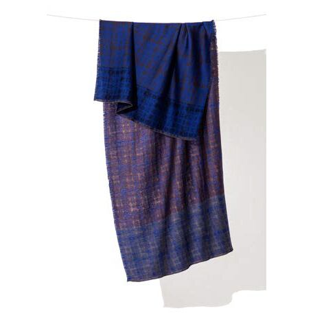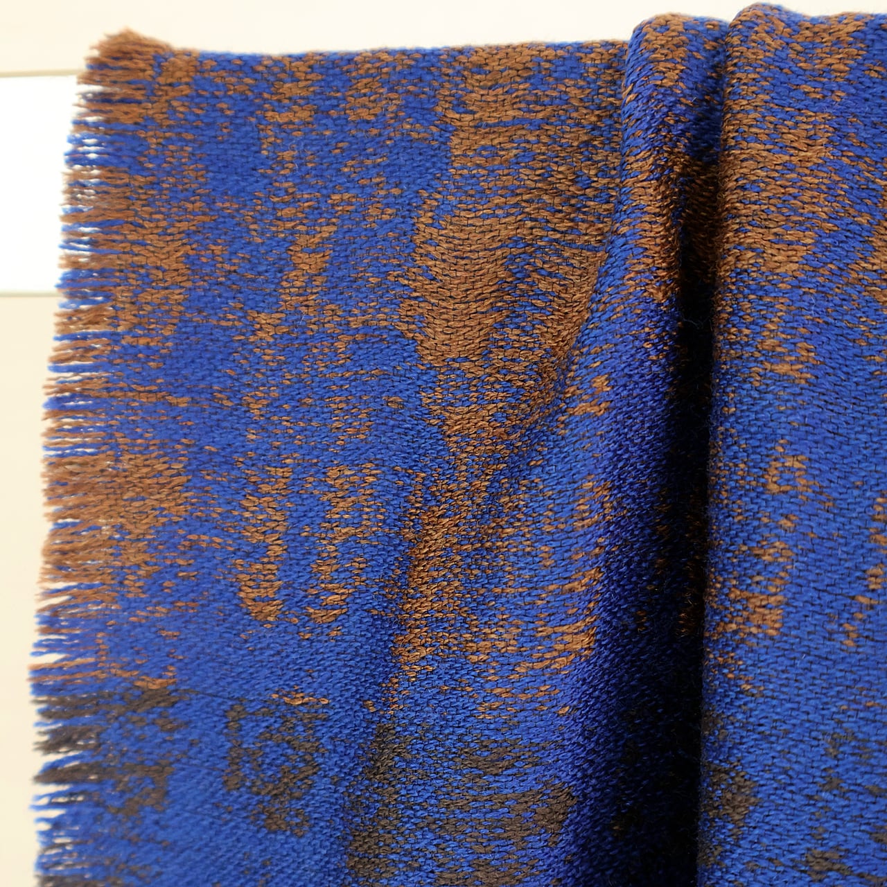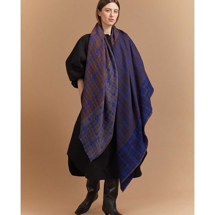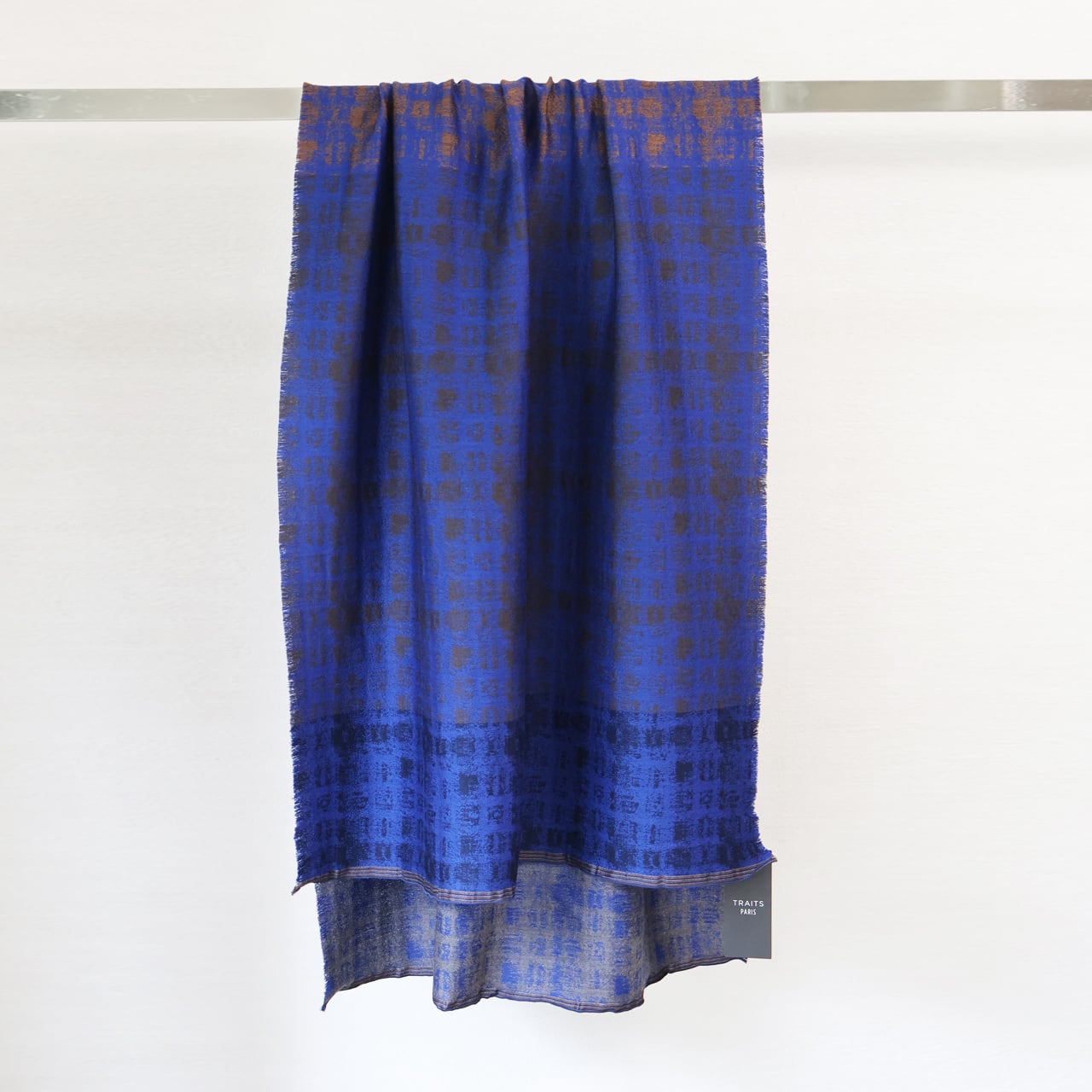 鮮やかなブルーをメインにブラウン・グレー・ブラックの糸が織りなすアートでクールな一枚です。巻く面で表情が異なり一枚で多様な印象に仕上がります。スタイリングにぐっと奥行きが増し冬の装いをシックに演出してくれます。