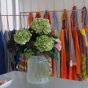 ドイツ出身の彼女はオリビエ・ラピデュスのもとで1990年からライセンス部門の責任者として仕事をし、並行してスカーフの製作を始めベルサーチのスカーフを作っていました。その後は、エルメス、ジル・サンダー、ヘルムート・ラングと仕事をしていたという経歴の持ち主。彼女の人柄も相まってとても温もりを感じる素敵なストールたちです。