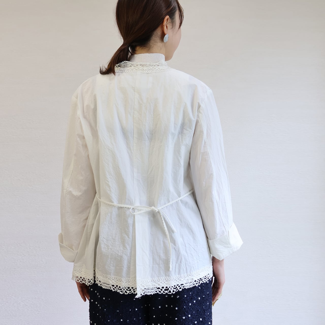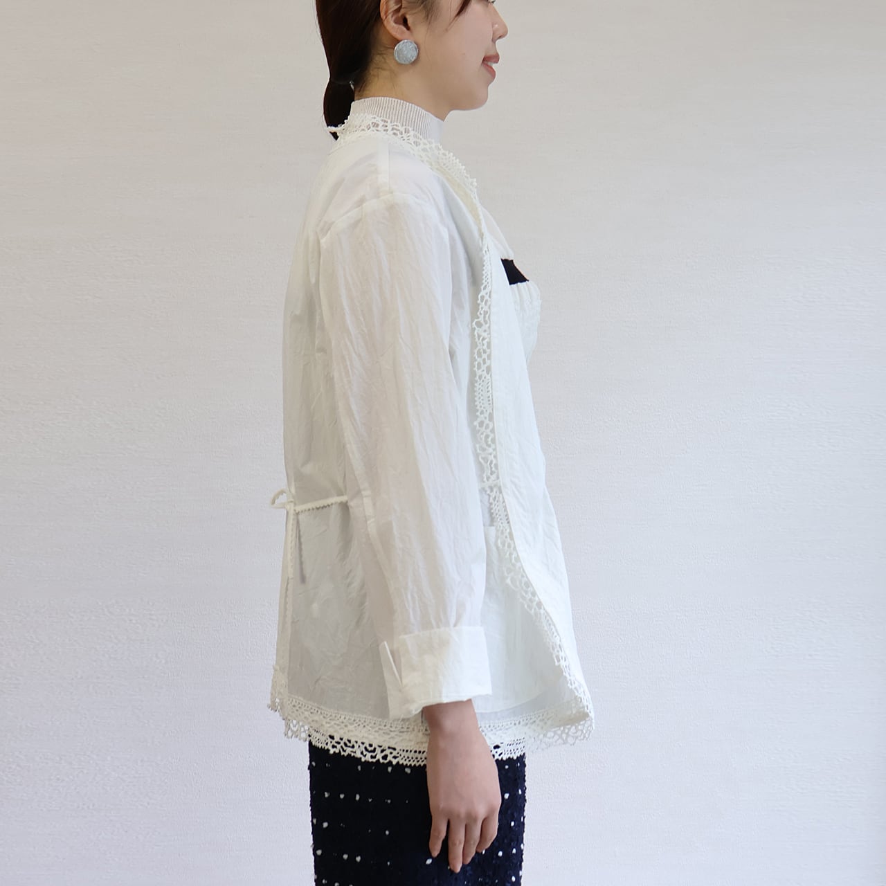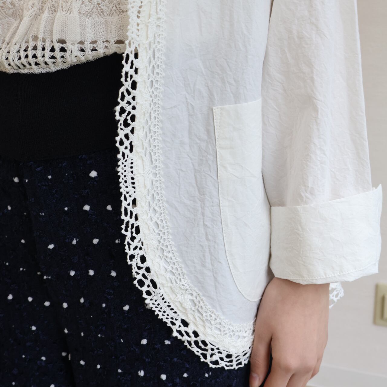 襟ぐり、身頃にスラブ感のある綿レースを使用したライトシャツジャケットです。