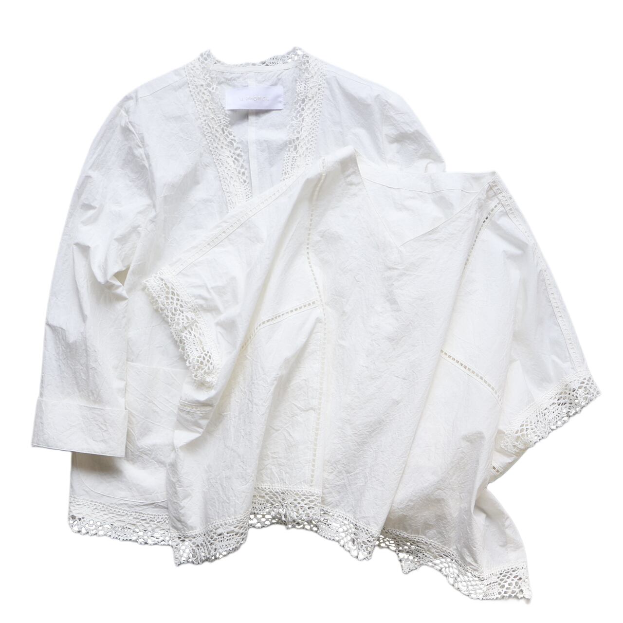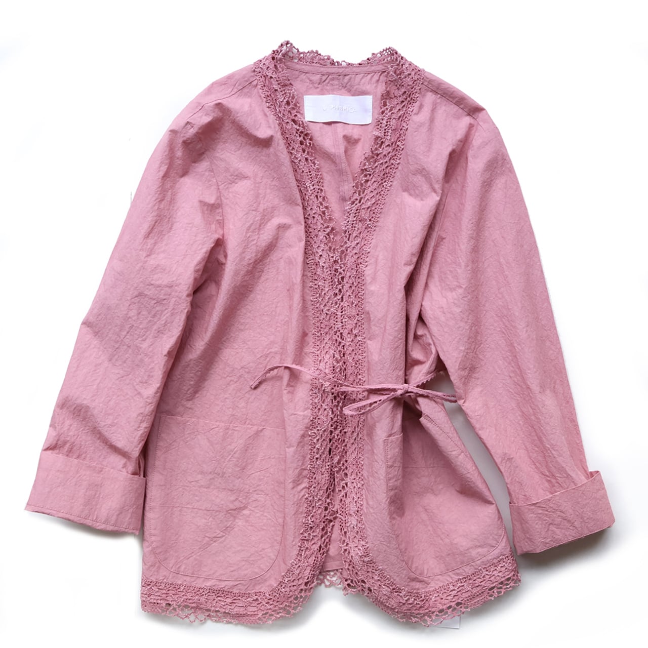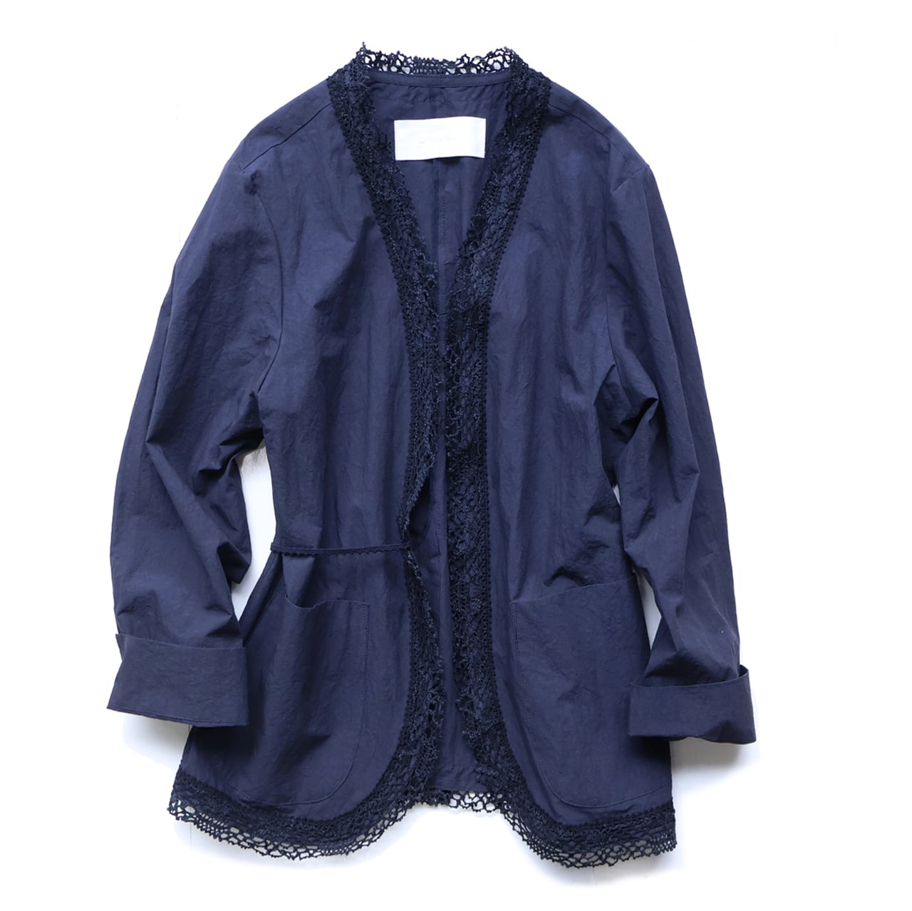 襟ぐり、身頃にスラブ感のある綿レースを使用したライトシャツジャケットです。