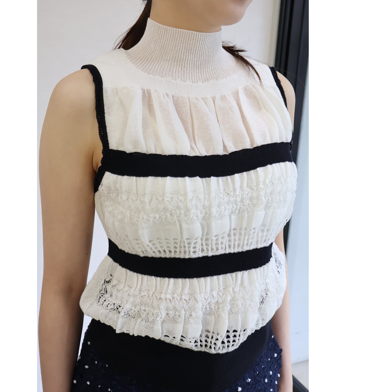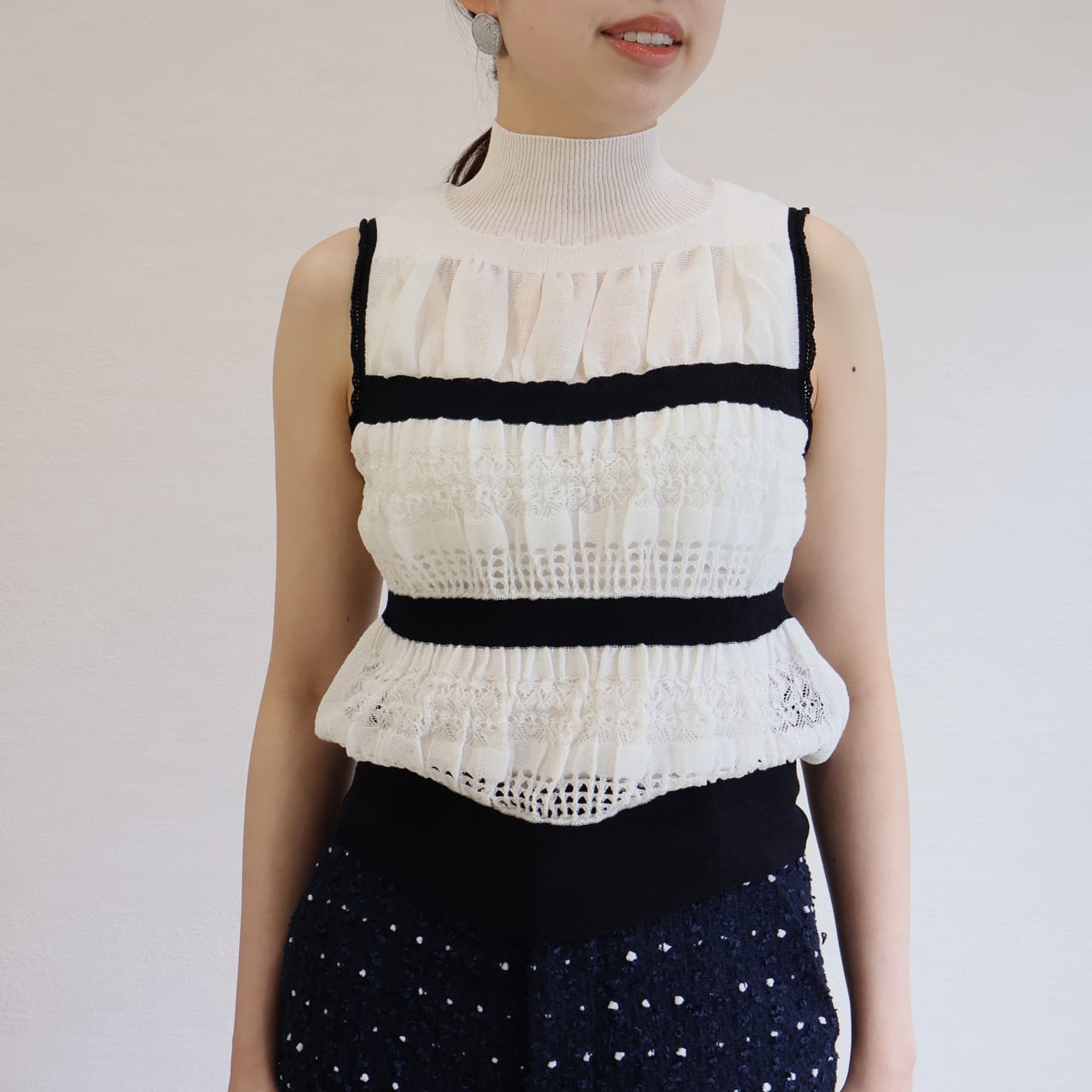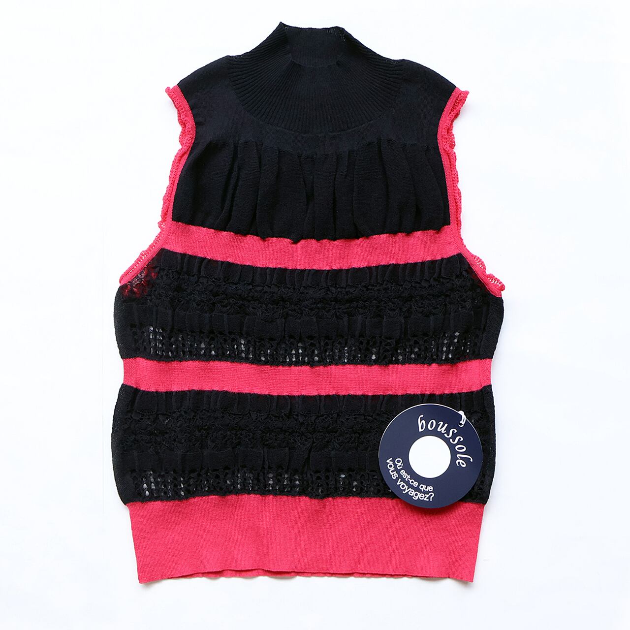 コットンベースの細番手の糸を繊細に編み上げたノースリーブニット。間隔が広めのストライプ部分に差し色を効かせて織柄の違いを楽しむデザインはラグジュアリー感たっぷり。様々な編地を得意とするboussole(ブソル)だからこそ叶う表情豊かなニットです。