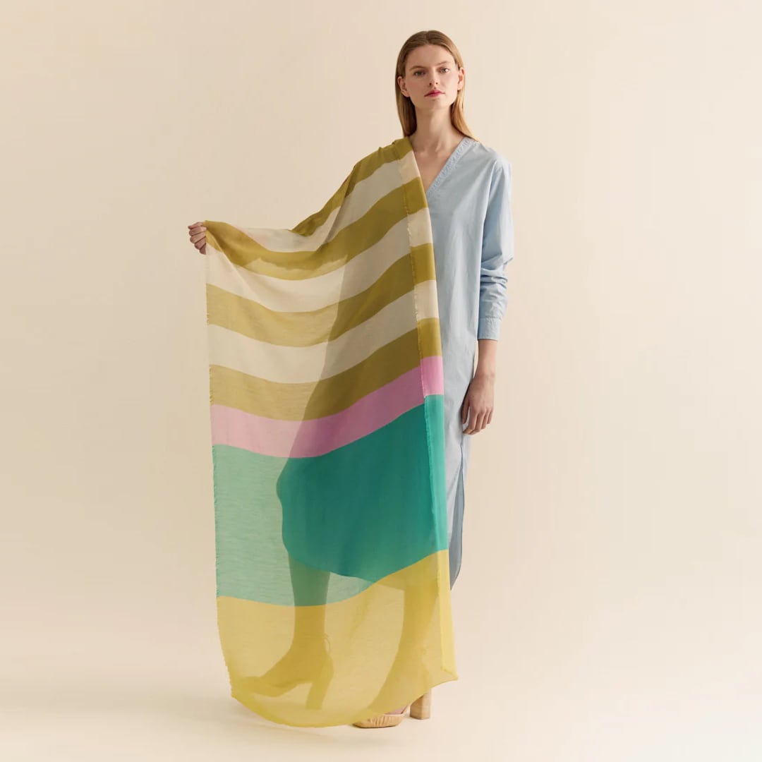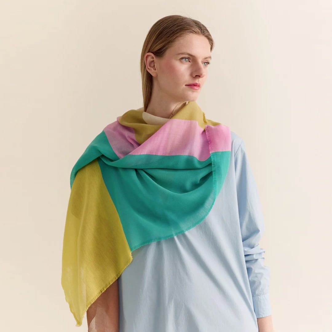 カラフルな色使いのストールは巻き方によっても見え方が変わります。