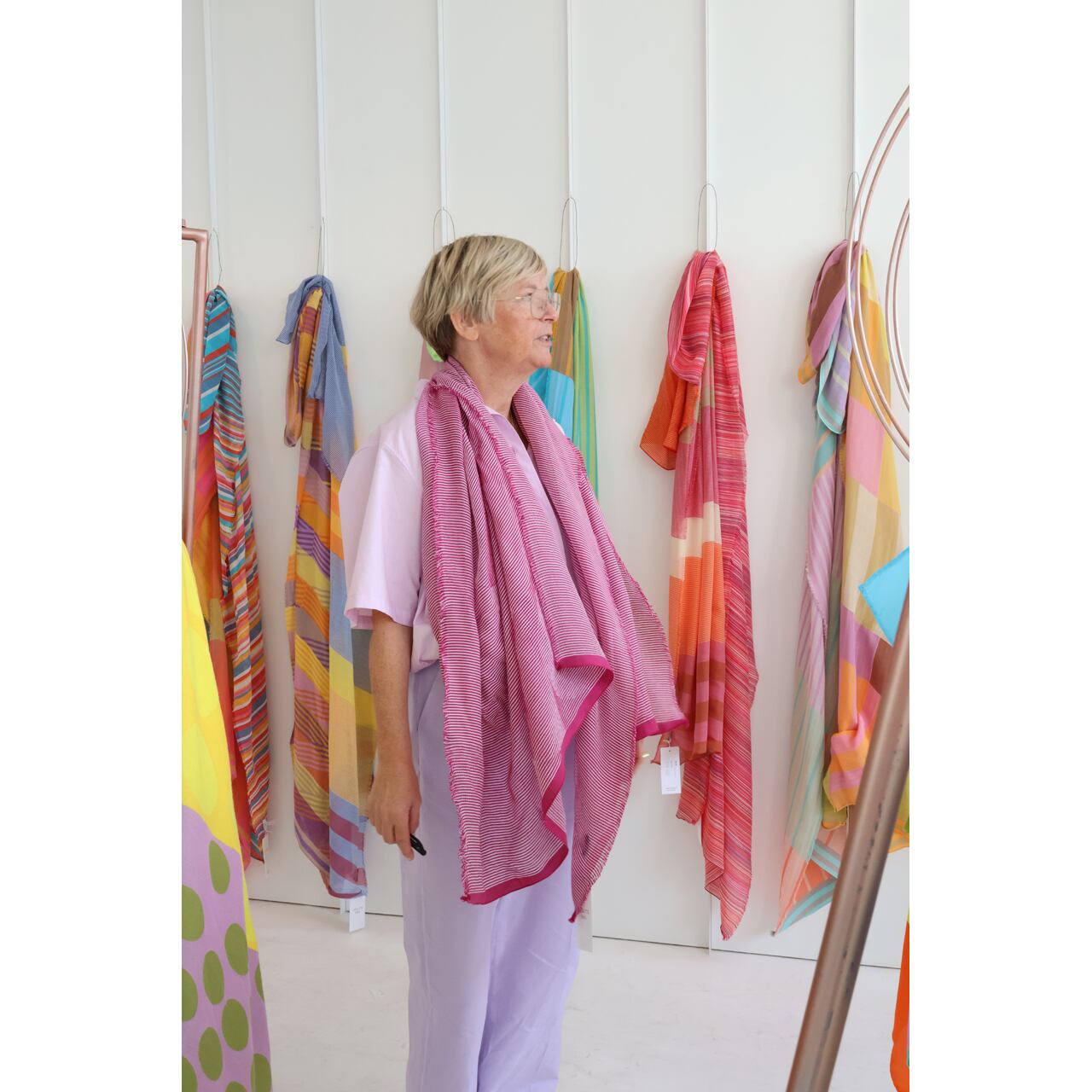 ドイツ出身の彼女はオリビエ・ラピデュスのもとで1990年からライセンス部門の責任者として仕事をし、並行してスカーフの製作を始めベルサーチのスカーフを作っていました。その後は、エルメス、ジル・サンダー、ヘルムート・ラングと仕事をしていたという経歴の持ち主。彼女の人柄も相まってとても温もりを感じる素敵なストールたちです。