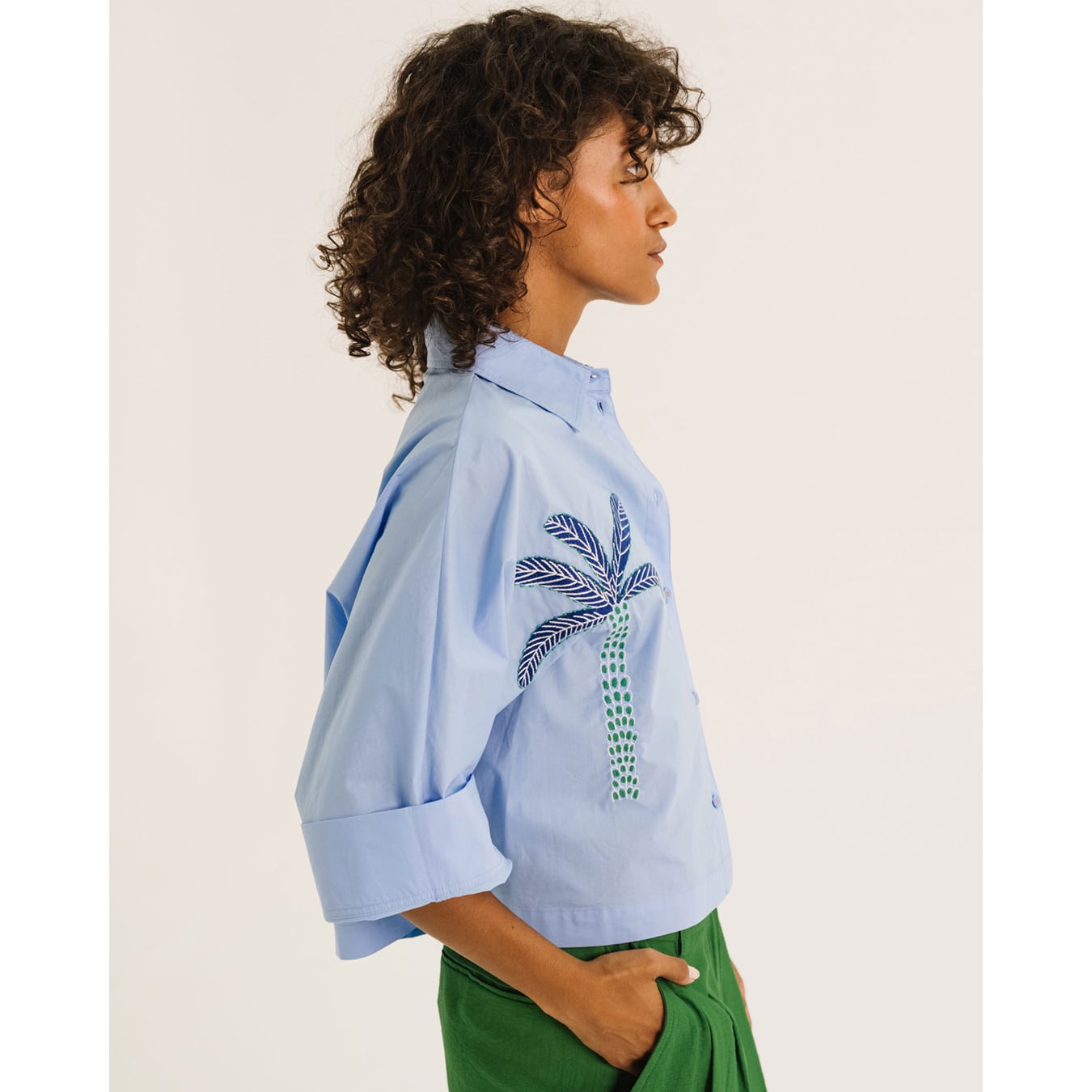 南国をイメージさせるヤシの木のオリジナル刺繍が施されたボックスタイプのシャツです。