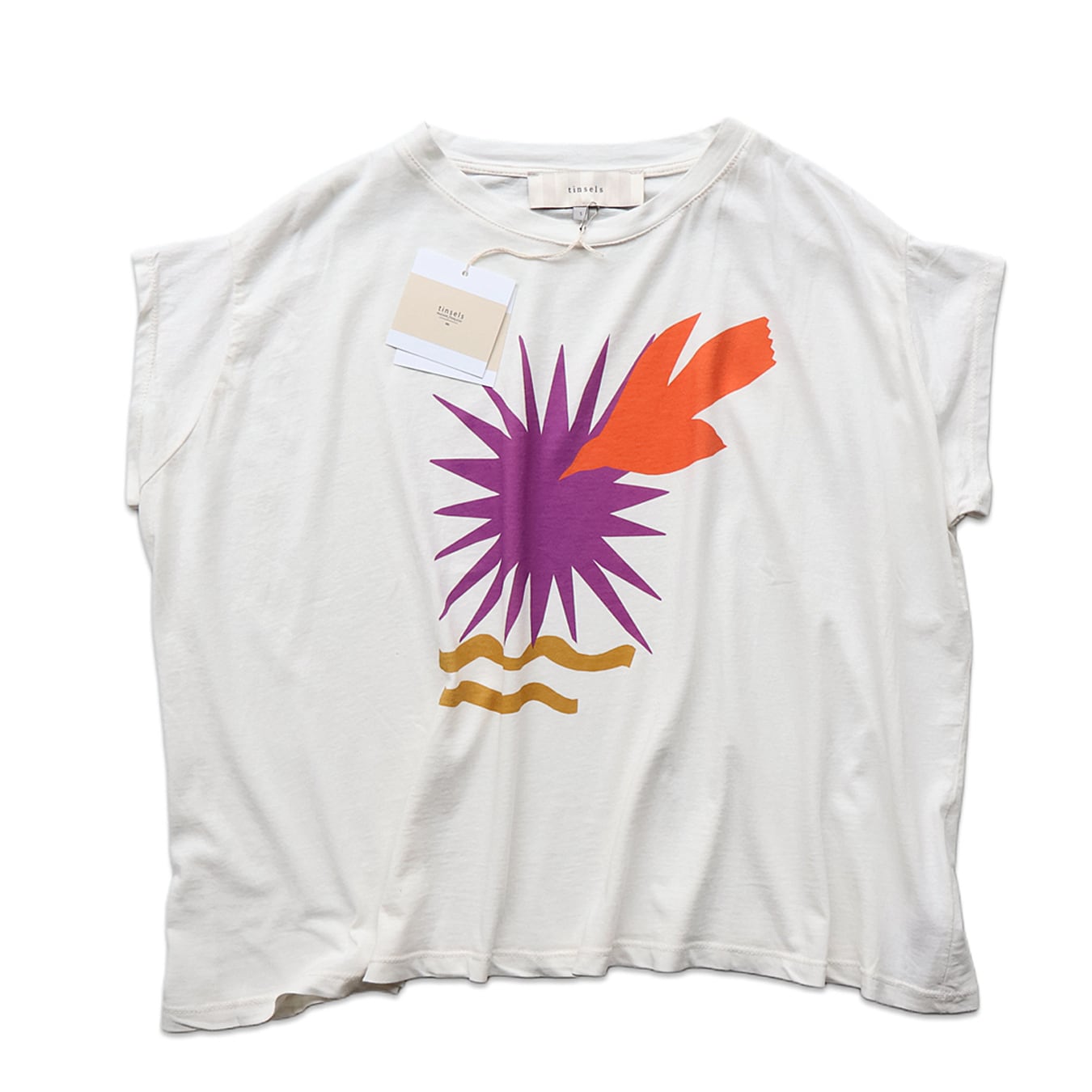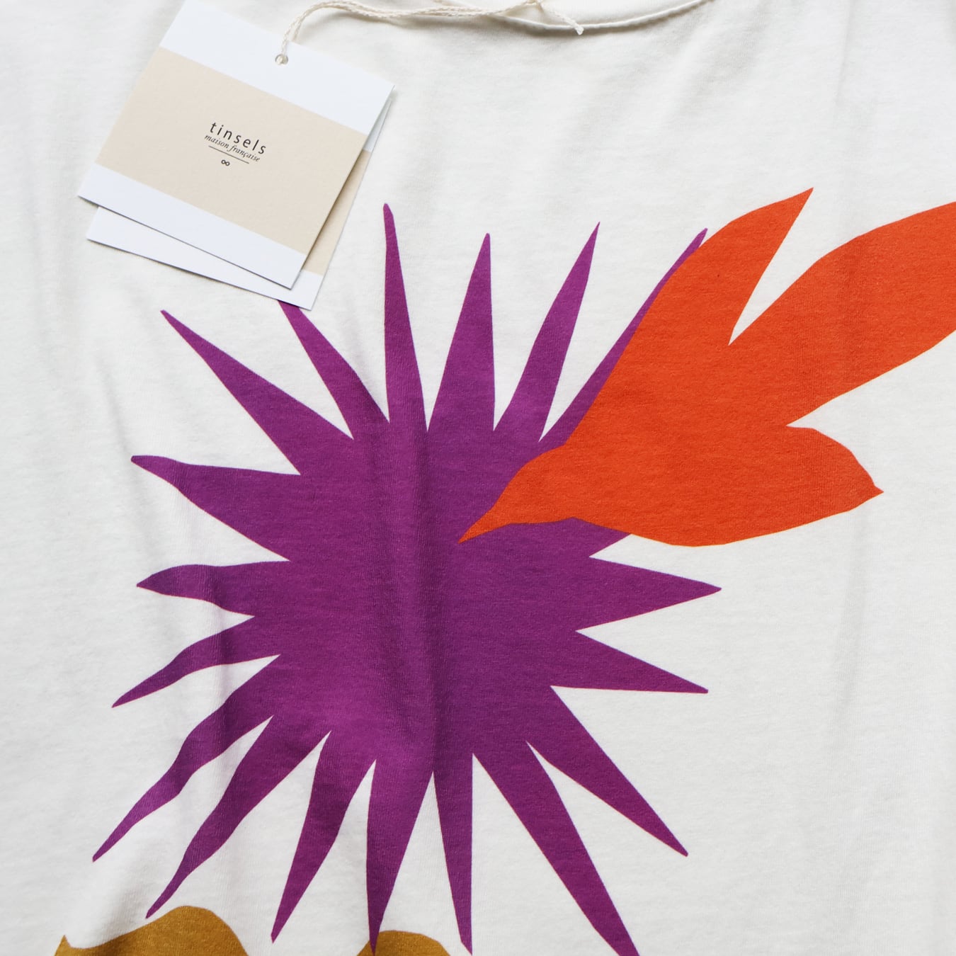 tinselsオリジナルプリントでオレンジとパープルが印象的なカジュアルな一枚です。